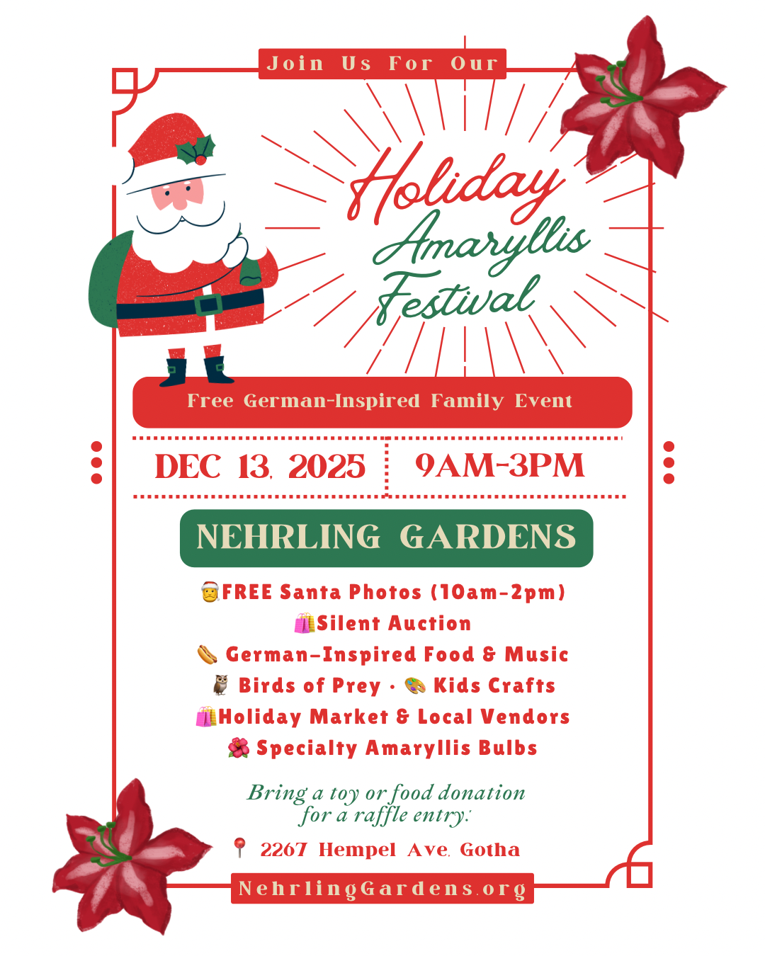 Amaryllis Festival Holiday Event at Historic Nehrling Gardens – December 13 | 9 AM–3 PM Celebrate the season at beautiful Nehrling Gardens in Gotha, Florida on December 13 from 9:00 AM to 3:00 PM! This year’s festivities feature a charming German-themed holiday market filled with unique local … Continued |