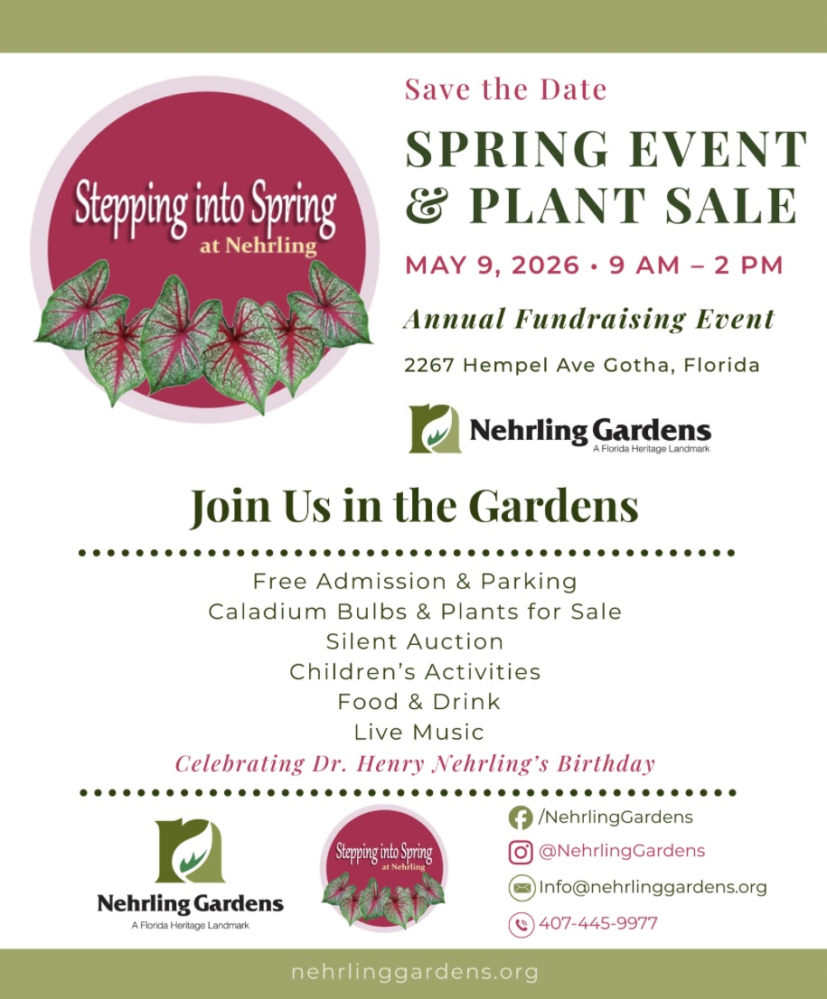 Join us for a free community event and fundraiser to celebrate Spring. We are excited have a variety of caladiums for sale this year from our amazing donors CLASSIC CALADIUMS, HENDRY CALADIUMS, FLORIDA BOYS CALADIUMS including cultivars: Splash of Wine, Classic Pink, Hot 2 Trot, Allure, Carousel and Carolyn Wharton. We will have eco-activities for the kids, a seed potting area in our fairy garden, local nature themed vendors, Storytime in the Garden by Orange County Public Library, raffle prize, live music and much more.